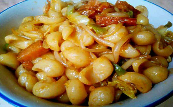 荞面:荞面一斤,水五两左右(除夏季外,一般都用温水和面)和起,扎匀扎光,稍醒后搓成指头粗的圆条,撒上面粉,用左手食指与中指夹住圆条,用右手切成指甲盖大的小剂子,然后用右手拇指在左手掌上,推成一个一个小卷,形状同猫耳朵一般。锅开后,抖去面粉煮熟。捞出后浇上浇头、调和,越吃越香。