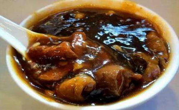 名炒肝儿,其实以猪肥肠为主,猪肝只占1/3。制作方法是先将猪肠用碱、盐浸泡揉搓,用清水加醋洗净后再煮??蟾挠梦幕痨溃歉呛檬钩ψ邮焱付慌苡?。烂熟后切成5分长的小段,俗称“顶针段”,再将鲜猪肝洗净,用刀斜片成柳叶形的条。佐料是在熬热的食油中放入大料,炸透后放入生蒜,蒜变黄时立即放入适量的黄酱,炒好置于罐中备用。此外还要熬些上好的口蘑汤。原料、佐料备齐后,始制作炒杆儿。先将熟肠段放入沸汤,再放入蒜酱、葱花、芡同“姜”末和口蘑汤,然后将生肝条放入锅中,以淀粉勾芡,最后撒上一层砸好的蒜泥即成?;嵯删拥某锤味雒?,北京四九城的小饭馆、小吃店都相继添了炒肝儿,市面上也出现了以炒肝儿为说词的俏皮话,如责骂人时说:“你这人怎么跟炒肝儿似的,没心没肺?!狈泶袒ハ嗖泻Φ娜擞胧略蛩担骸爸戆私涑猿锤?,自残骨肉?!?/p>