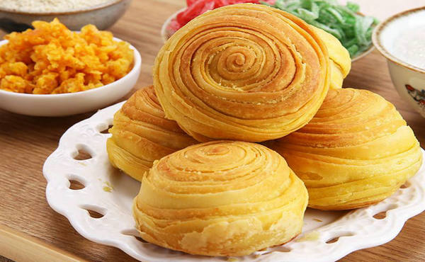 相传在公元九五六年,周世宗征讨淮南,大将赵匡胤攻了九个多月才打破城池,取得成功。由于疲劳过度,赵匡胤进城后就病了,他胃口不佳,茶饭不进。这时,有个巧手厨师为了让他进食,便精心制做了一种点心。用上好的白面、白糖、猪油、香油、青红丝、桔饼、核桃仁等材料做了一些带馅的圆形点心。这种点心的外皮有数道花酥层层叠起,金丝条条分明,中间如急流旋涡状,因用油煎炸,色泽金黄。