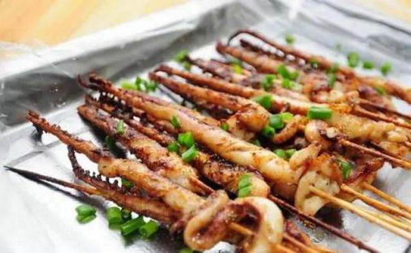 铜陵烤鱿鱼,是铜陵一道特色美食,将整条鱿鱼或将两侧切成丝,一般都是手掌大的小鱿鱼,放在烤具上,加入辣椒等配料,进行烧烤,将烤好的鱿鱼穿成串,一般一串只有一条鱿鱼。但不同的是,由于某些地区禁止煤烟,所以就将鱿鱼放在铁板上,煎制鱿鱼。两者的味道,都差不多。