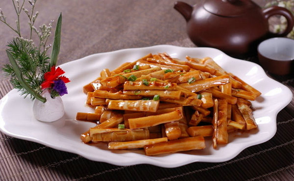 2.将冬笋带壳埋在木柴火灰中,焖到用手按着笋觉得发软时,便可取出。剥去笋壳,砍掉老根j用刀断成劈柴块状,放在调好的卤汁的碗内拌匀,装在盘中即成。