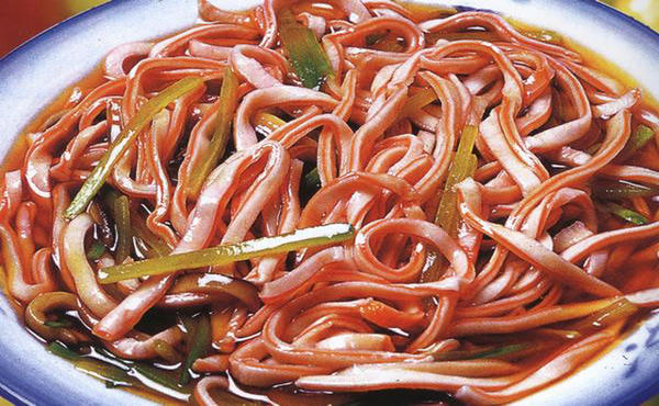 长治黑圪条是山西长治著名的汉族小吃。是用红面包住白面或白面包住红面,或混合搅拌和成的面团用手工擀制成大片,再切成8寸长,韭叶宽,或裙带宽的条,下锅煮熟的一种面食,是长治地区流传的一种黑色面条。因煮熟的面条黑红色,故得名“黑圪条”。黑圪条主要原料是高粱面,做时再掺些白面和豆面更好。