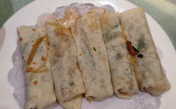 要说到卷白馍的做法,它可是饼和菜的结合,其实做起来也并不难。首先,要将面粉用热水烫过并和好,再蘸点冷水拍一下,直至面里的热气散尽。然后揉成长条,再切成均匀的面团,接下来,把一个个面团擀成薄饼,并放入煎锅内烙。“好花还需绿叶扶”,饼烙好了,菜也是必不可少的。这菜可以根据自己的喜好来定。一般家里常用粉条、绿豆芽、菠菜、胡萝卜、木耳等。这里只需把胡萝卜和木耳切成丝,按照难熟的菜先炒,易熟的菜后下锅,待菜炒好后,我们便要卷了。铺饼摊菜,一一卷来。很快,一盘色、香、味、形样样俱全的卷白馍就做好了。