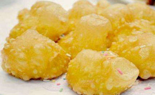 4、经炸后,糕面出现薄如蝉翼、白如霜雪的一层泡,犹如繁花盛开,似乎见风即消,入口即化,松软绵润,芬芳醇香。