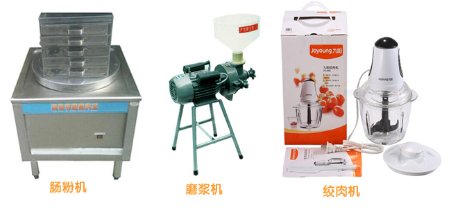 开肠粉店不像其他小吃店那样需要很高档的装修和设备。一般做肠粉,除了我们平时常见的锅碗瓢盆、桌椅板凳之外,就是还需要几台专业一点的机械设备,它们是:肠粉机,磨浆机,绞肉机,冰箱,这四种。