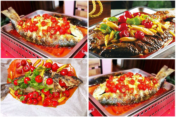 剁椒烤鱼:火辣辣的红剁椒,覆盖着白嫩嫩的鱼肉,冒着热腾腾清香四溢的香气。湘菜香辣的诱惑,在“剁椒鱼”上得到了完美体现??局频姆椒ㄈ糜愕南氏惚痪×勘A粼谌庵手?,剁椒的味道又恰到好处地渗入到鱼肉当中,鱼肉糯软,肥而不腻,咸鲜微辣。入口细嫩晶莹,带着一股温文尔雅的辣味。